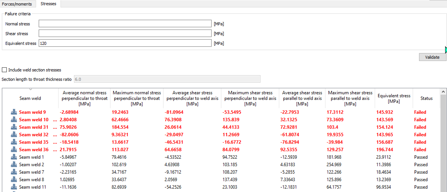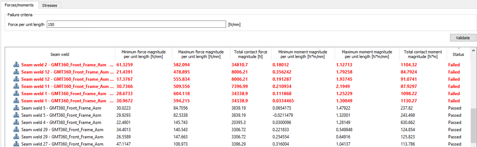 評価される値は、提供された疲労基準に基づいて検証され、各溶接のステータスを示します。しきい値範囲内にない溶接は、不合格のステータス(赤で強調表示)となります。