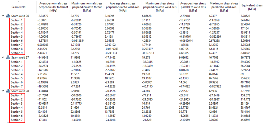 注: 各溶接部の総接触力と平均応力の表示に加え、シーム溶接の合力とスロート部の応力も単位長さごとに評価することが可能です。この評価のためのデータ点数は、溶接の長さによって自動的に決定されます。シーム溶接の設計基準、特にEurocode 3(EN 1993-1-8)で、単位長さあたりの合力と応力を使用することができます:Eurocode 3:Design of Steel Structures, Section 4.5.3)。 - オプション: 各パラメータのヘッダーをクリックすると、最大値から最小値、または最小値から最大値の順にソートされます。