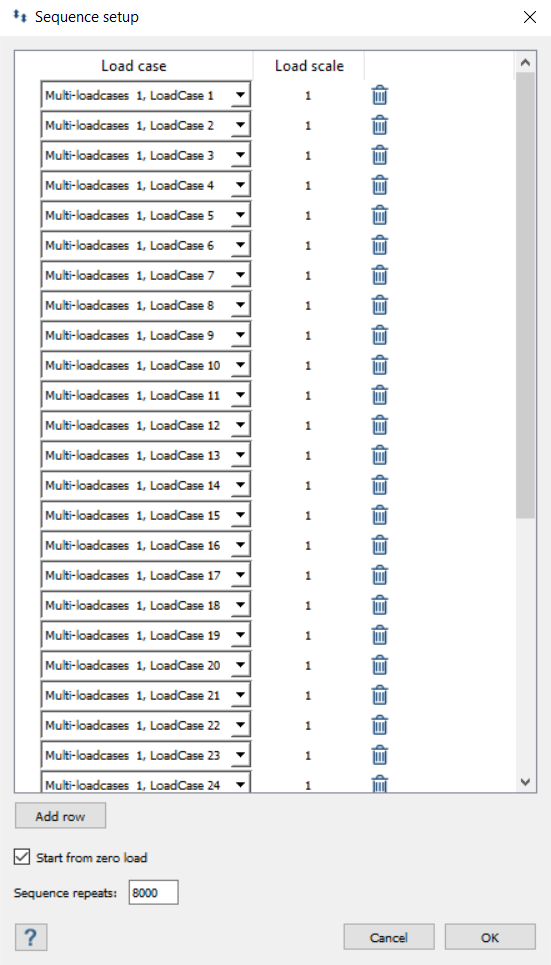 シーケンス繰り返しと荷重ケースが.csvファイルで指定された順序で一覧表示されます。荷重ケースを追加または削除するか、荷重スケールとシーケンス繰り返しを変更することで、シーケンスを編集できます。