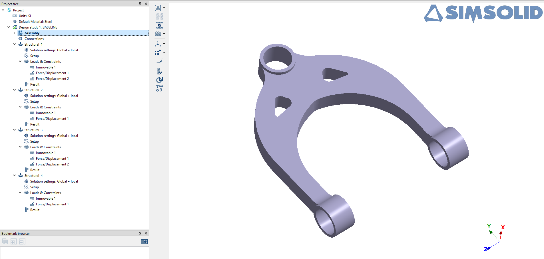 - SimSolidは、簡略化されていない形状を使用したパートとアセンブリに対して機能するメッシュレス構造解析を実行しますが、ジオメトリの不完全性に寛容で、数秒から数分で実行を完了します。このチュートリアルでは次の操作を実行します: