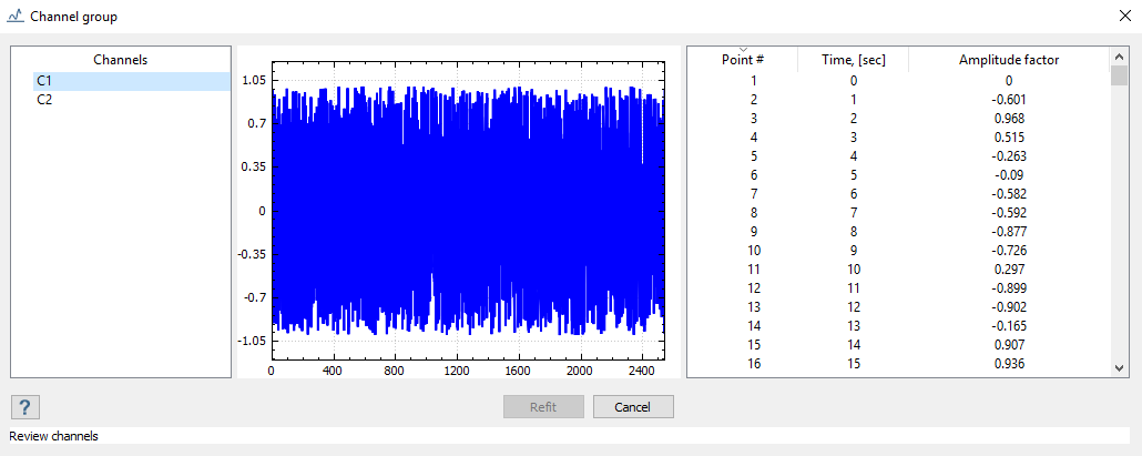 チャンネルグループダイアログが開き、荷重履歴ファイルで使用可能なチャンネルが、そのプロットと座標とともに一覧表示されます。それらを切り替えながら、プロットを表示できます。注: このダイアログからチャンネルを編集することはできません。