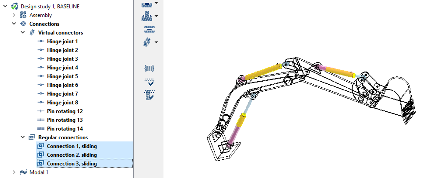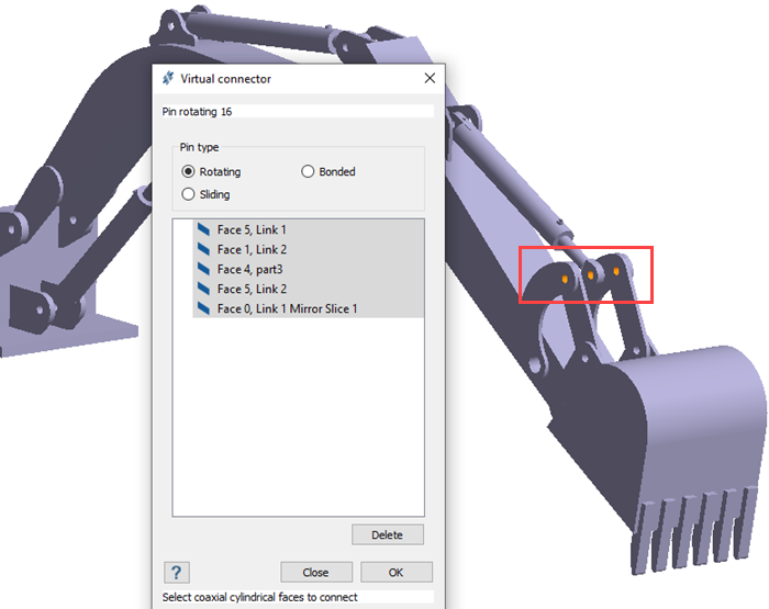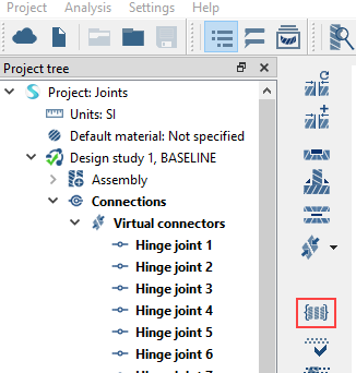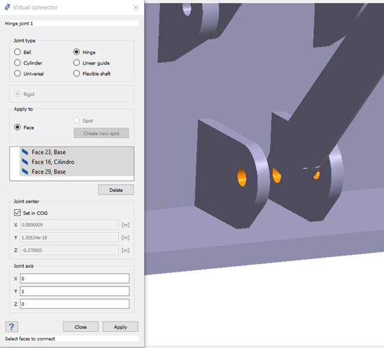 注: ヒンジジョイントと仮想ピンの違いは次のとおりです。- ヒンジジョイントでは、対象とする軸を中心とした回転のみが可能ですが、ピンでは回転、固着、滑りが可能です。