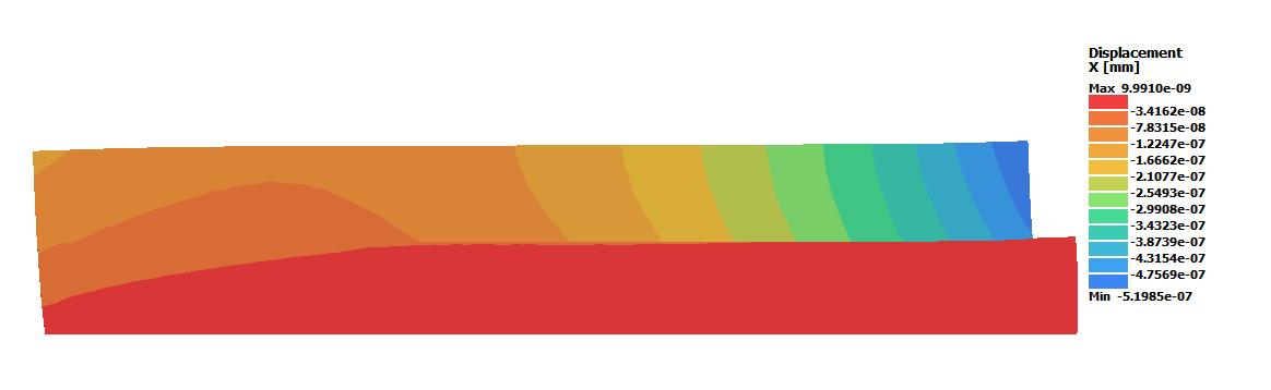 が 0.29 Nまで減少します。このケースでは、部分的な滑りのみが発生します。梁の左端に明確な”粘着”接触領域があります。