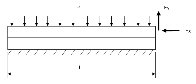 によって梁の滑りが生じやすくなりますが、これは、接触領域全体に分散された摩擦力によって抵抗されます。釣り合い状態では、力は水平軸に投影されます: