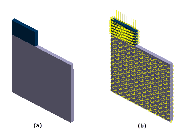 剛体パンチとベースのジオメトリは、厚さ10 mmの2つの3Dソリッドプレートを使用してシミュレートされました(図 2)。平面ひずみ条件は、プレートの側面に垂直な方向のひずみをゼロと仮定します。この条件を満たすために、プレートの両側にゼロの垂直変位を適用しました(図 2b)。