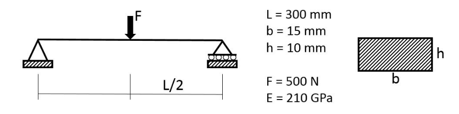 テスト番号VS13 中間点に荷重がかかるピン留めされた梁に対する最大変位と応力を求めます。