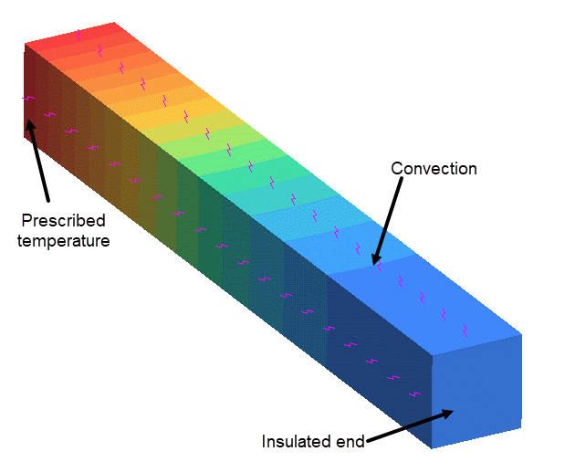 テスト番号VT01 流体で囲まれた冷却フィンの一方の端を一定の温度に維持した状態で、もう一方の断熱された端の温度を求めます。