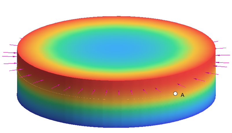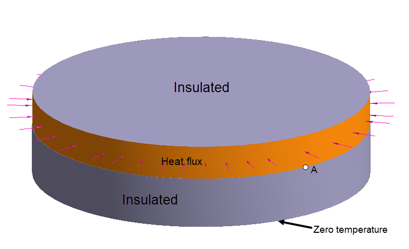 円筒が、側面のストリップに沿って所定の熱流束荷重を受けます(図 1を参照)。底面はゼロ温度に保たれ、上面と側面の残りの部分は断熱されています。ストリップと側面の残りの部分との境界の温度を求める必要があります(図 1のポイントA)。