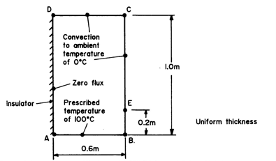 境界条件:エッジAB - 温度100℃、エッジDA - 熱流束ゼロ、エッジBC、CD - 環境温度0℃への対流。