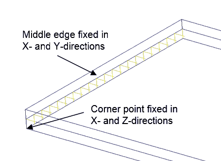 梁の層は、接着されたソリッドによってシミュレートされます。基準で使用される梁理論の境界条件を可能な限り再現するために、梁の”固定”端の中心線のエッジは横方向に拘束されます。エッジを中心とした回転とエッジに沿ったスライドを排除するために、上部ファイバーのコーナーのポイントは2方向に固定されます(図 2)。