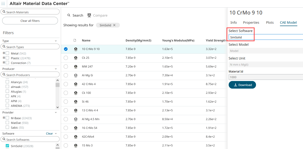 在 SimSolid 中使用 Altair Material Data Center 的材料数据。