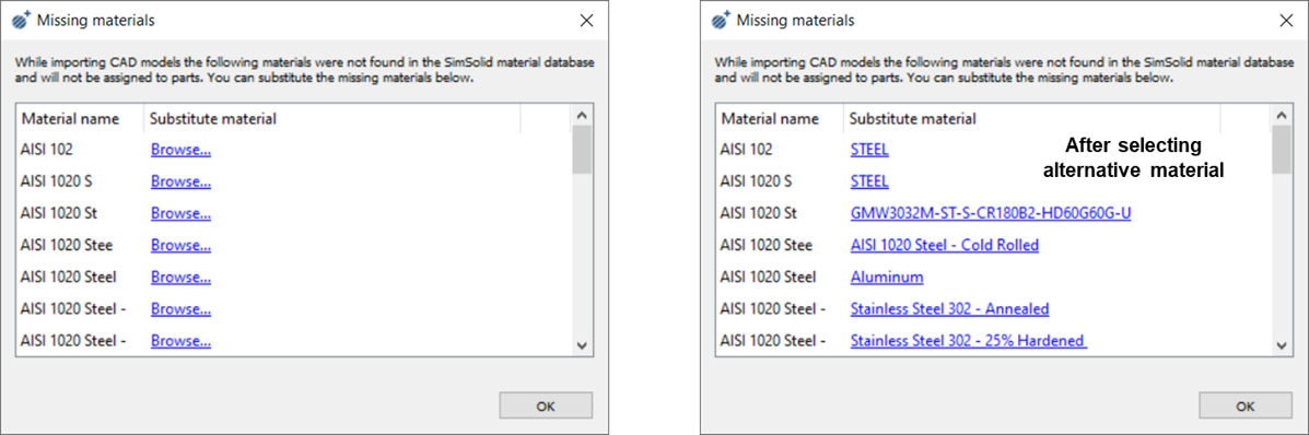 注: 除插件文件和 STL 格式外,SimSolid 可以通过当前使用的所有 CAD 格式从装配或作为零件文件导入蒙皮。 - 导入材料
