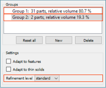 组在几何体自适应中也发挥着关键作用。组的比例影响几何体分解的初始细化级别,类似于在传统有限元 (FE) 分析中定义全局网格参数。例如,如果一个零件占据了 80% 的体积,它将决定该装配的初始细化级别,从而可能导致其他较小组件的细化不足。