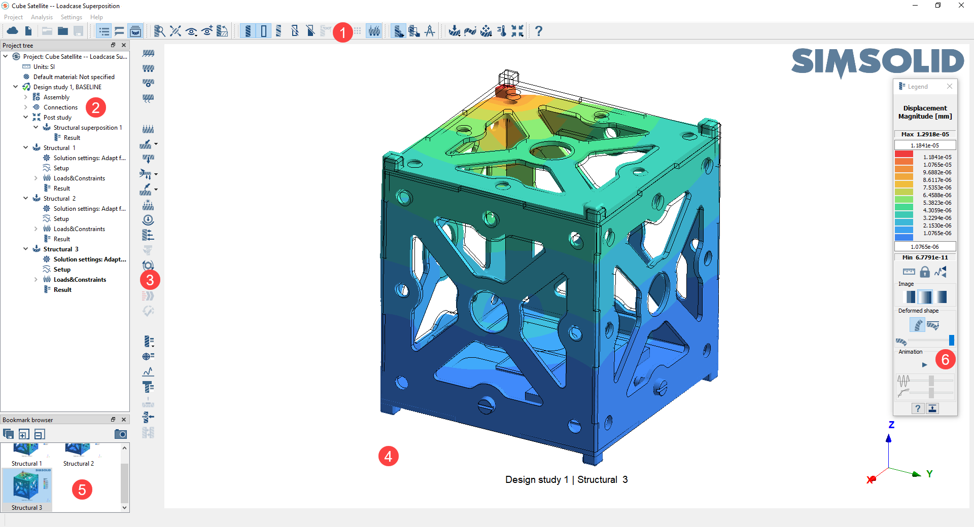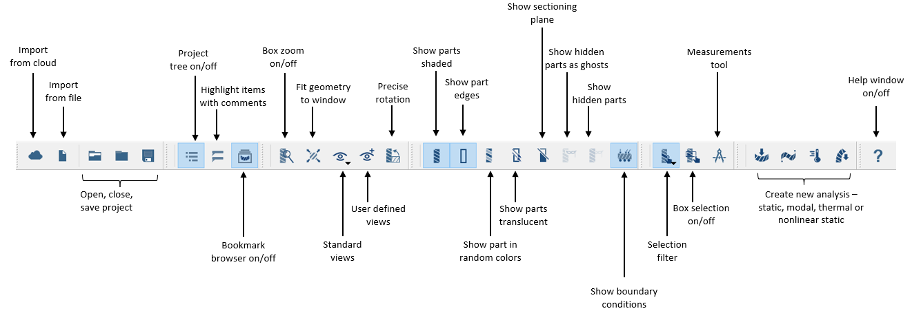 - 项目树 - 项目树用于管理各个模型实体。项目树的主要分支称为工作台。每个设计研究将有一个工作台和一个连接工作台,其定义适用于所有设计研究分析。设计研究可以包含任意数量的分析。