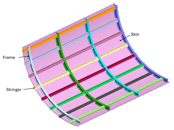 图 1 显示了本教程使用的机身模型。机身的纵梁和蒙皮作为 CAD 曲面导入,而框架则是作为实体薄片导入。在本教程中,您将为弯曲的蒙皮和突出的纵梁制作层压板。