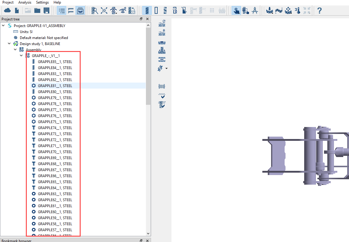 装配将加载到模型视窗中。钢被施加于零件。