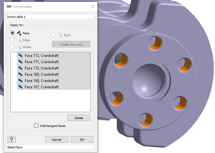 - 在对话框中,点击 Select a cylinder 单选按钮,然后选择施加了圆柱旋转铰链 1。