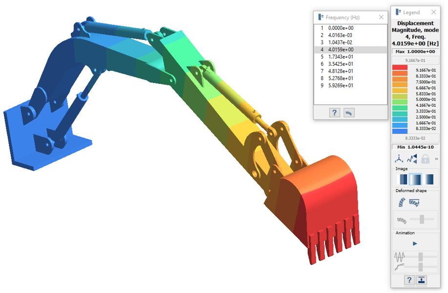 图例窗口会打开并显示云图。频率 (Hz) 窗口会打开,并显示各种模式。