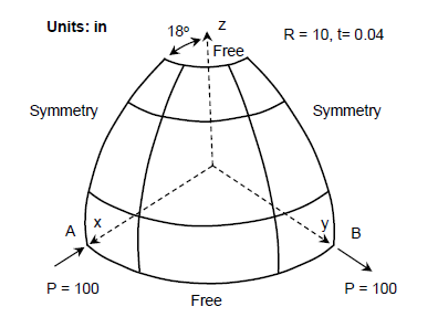 半球壳体在 A 点和 B 点分别承受向内和向外的集中力。半球的顶部有一个 18 度的孔,半球的象限是利用对称边界条件建模的(图 1)。相应地,如图 1 中所示的力 P 作用于象限。A 点和 B 点的位移将根据力值 P=40、60 和 100 lbf 来确定。