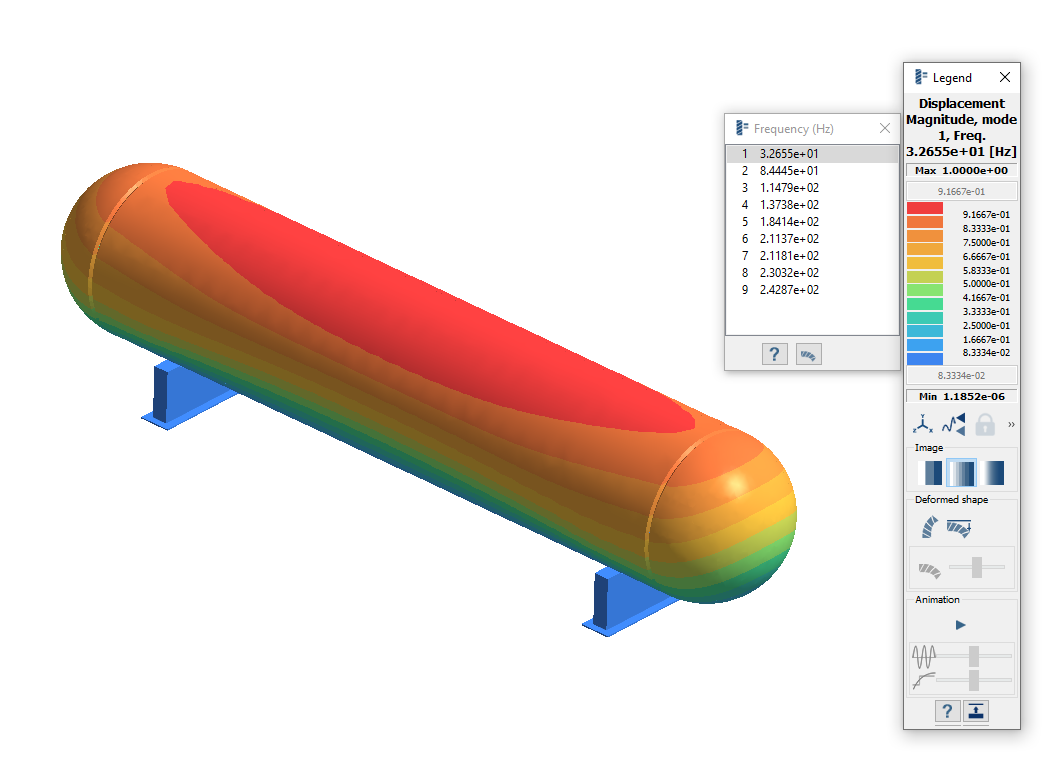 图例窗口将打开并显示云图。频率 (Hz) 窗口会打开,并显示各种模式。