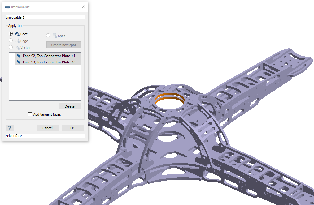 - 点击确定。新约束,固定 1 会出现在项目树中。约束的可视表示会显示在模型上。