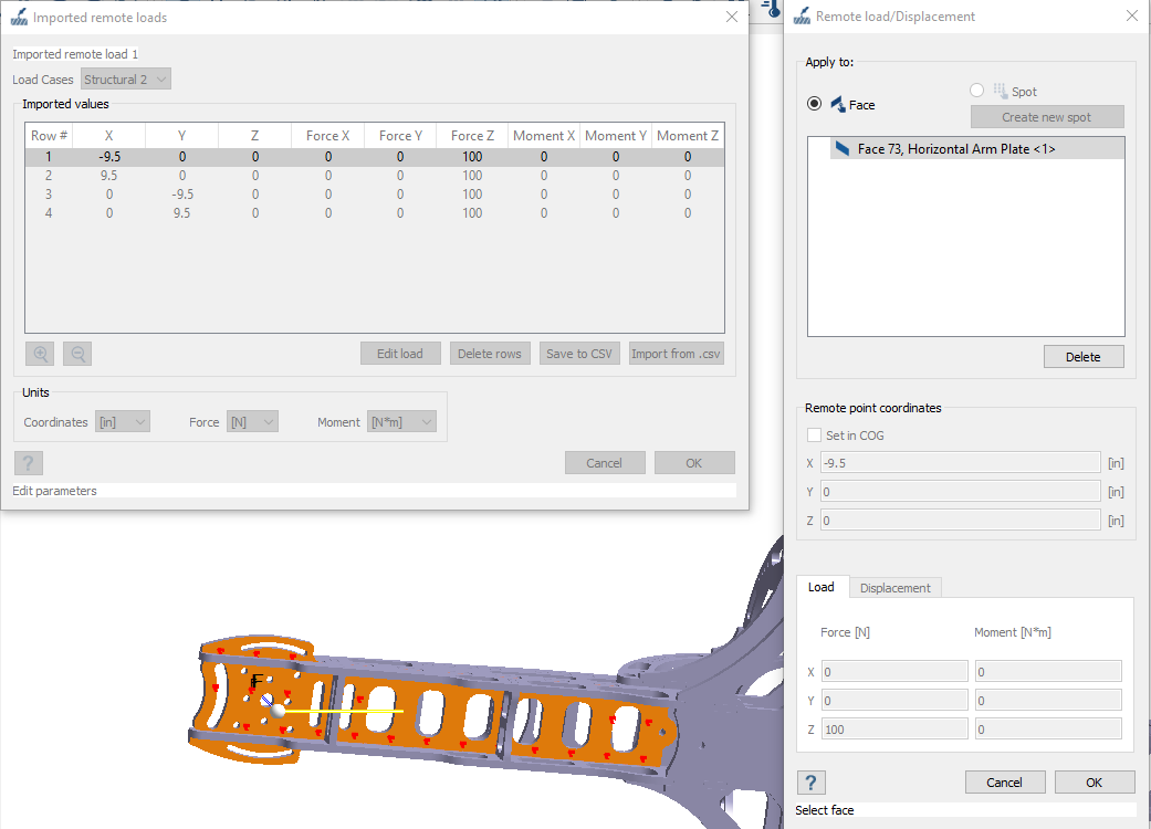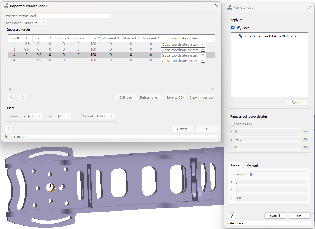 导入的远程载荷显示在对话框中,并映射在 模型视窗。通过点击编辑载荷或双击行来编辑对话框中的值。