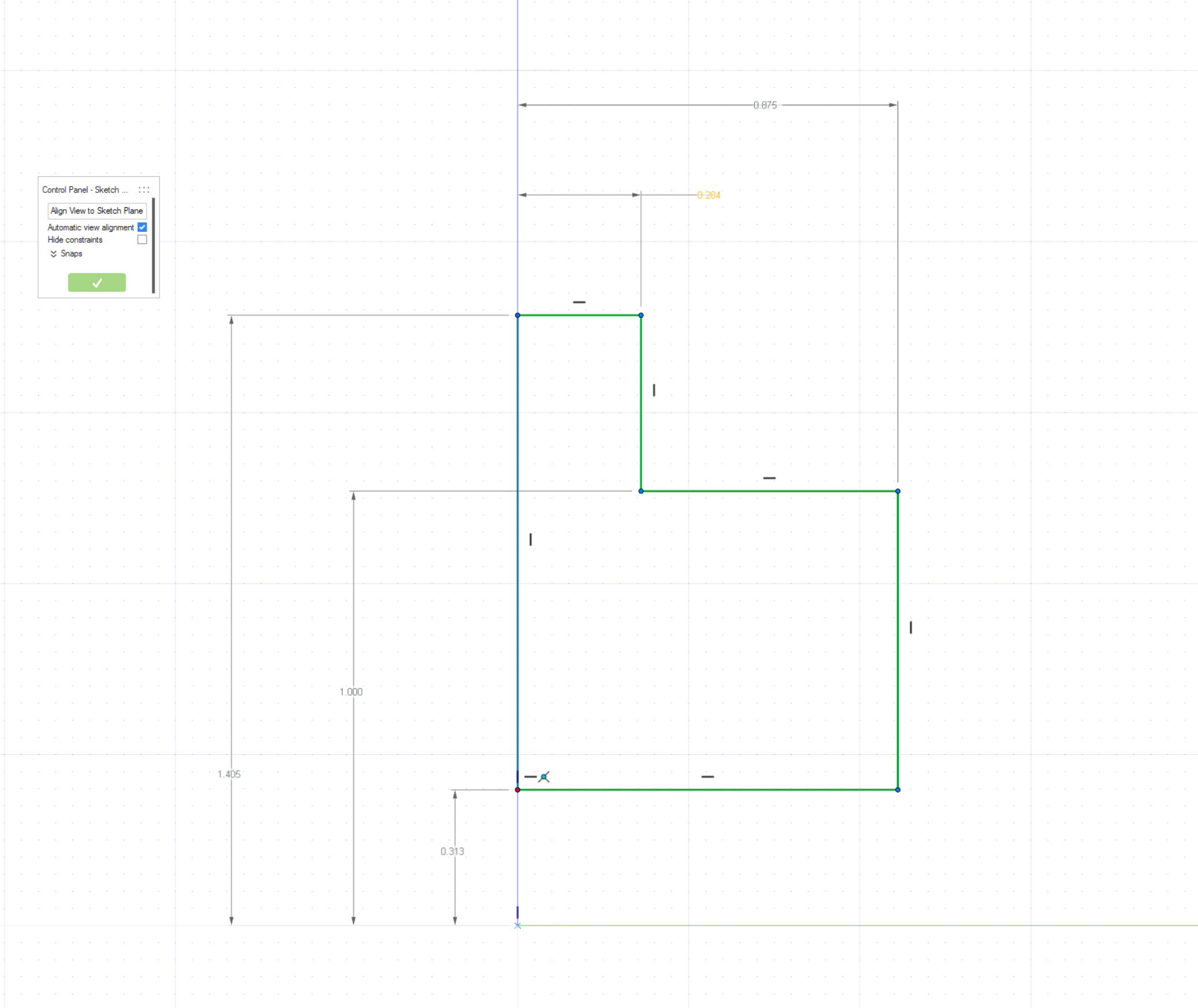 Note: Fully defined sketches are drawn in green. Although it is not mandatory to fully define sketches, it is good practice. In some cases, a horizontal or vertical constraint with the origin point may be needed to fully define a sketch.