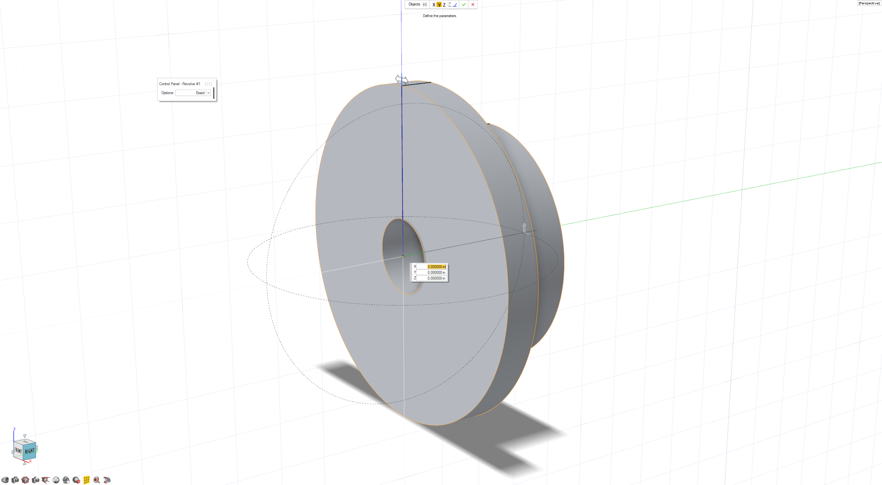 - Revolve the sketch around the Y axis. To center the revolution, select the origin point and change the X, Y, Z values to 0, 0, 0.
