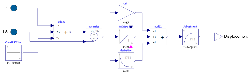 The LS controller is a pressure control with an additional LS offset pressure to compensate the losses of pressure compensator valves. The inputs are normalized to the LS pressure, so that the input of gain, integrator, and derivative has the dimension 1. The output also ranges from 0 to 1 according to the displacement input of pumps.