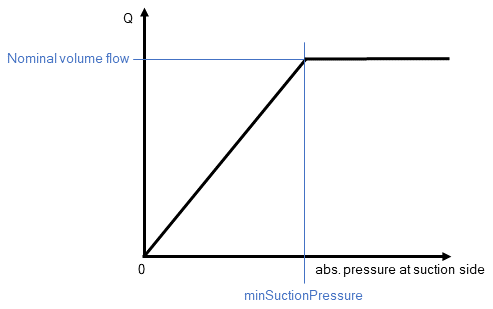 minSuctionPressure takes into account that a pump requires a minimaum suction pressure for full flow. Below this pressure, the flow rate is reduced. In this model, the reduction is assumed to be simplified as a linear function of suction pressure in relation to minSuctionPressure.