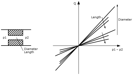 The Throttle is suitable for modeling a bore, if the ratio of its length l to its diameter d is comparatively large (approx. l/d > 10). It does not take any inductance into consideration. If desired, a PipeWithoutCapacity or a Pipe is the correct component instead.