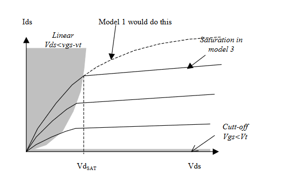 The characteristics described below apply for a NMOS (see Mos3N). For a PMOS, the Ids and Vds axis have a negative sign.