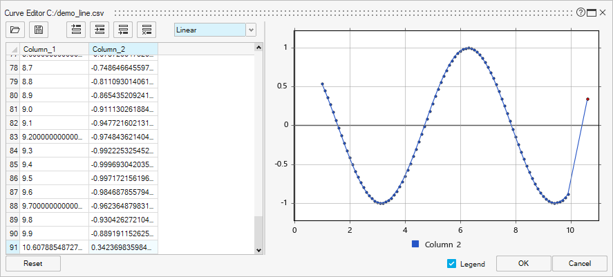 Delete the selected data points. Interpolation method drop-down list Select an interpolation method from the drop-down list to the right of the icons. Legend Select the check box to display the plot legend. Reset Select the Reset button to restore the default values for your curve.