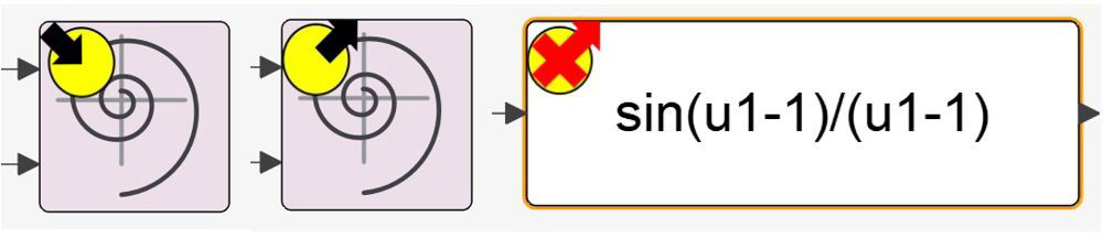 The correspondence between basic blocks in the list and blocks visible in the diagram is one-to-one for most blocks. When paused, the full name of the block is shown at the top of the dialog box. To open the diagram containing the block, click Show in the upper right. The block is marked with a specific icon in the diagram indicating whether the pause is a pre-call, a post-call, or post-call subsequent to an error. These icons are shown in the image below.