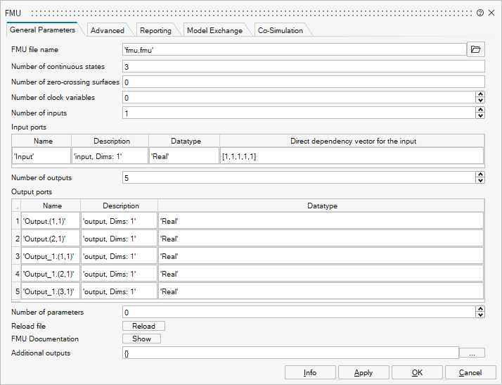 The block dialog lets you select and load an FMU block. You can enter values in the fields such as the number of inputs, outputs, and states, or click Reload to read the FMU block and populate the fields automatically. In the Parameters table, the FMU variables that have an editable start value are displayed. Changes to the values are incorporated before a simulation starts.