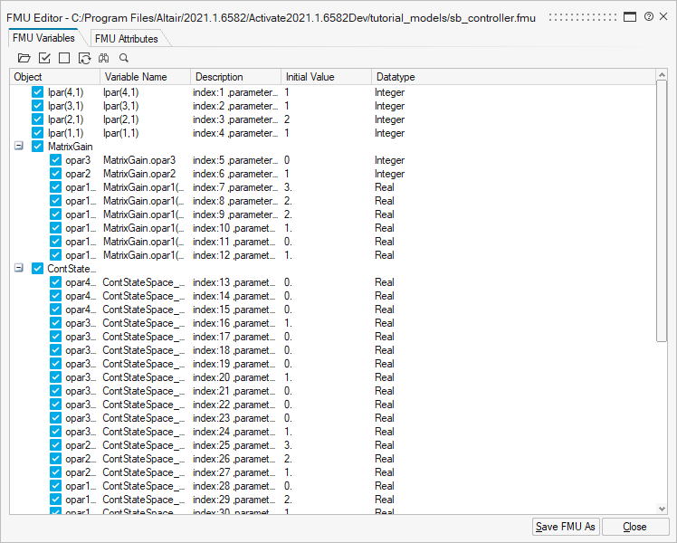 - Use the FMU editor tools to work with the variables: select/deselect