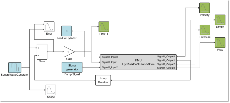 After the dialog is populated, the FMU block can be added to a model diagram. The following example shows an FMU block in a diagram facilitating co-simulation with a hydraulics software product.