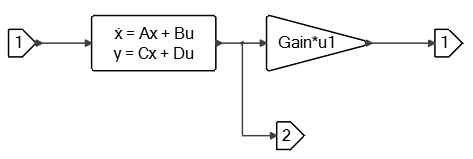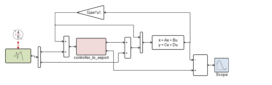 The controller-to-export super block contains a linear system and matrix gain block with one scalar input and two vector outputs: