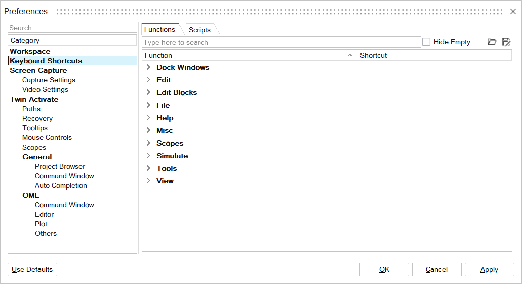 The Functions tab provides a tree structure of the tools available for shortcut assignment. Use the Hide Empty check box to reduce the list to the functions that currently have a shortcut assigned.