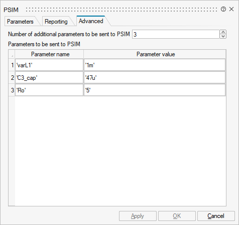 Choose the number of variables that should be passed to PSIM and provide their name and their values in the table.