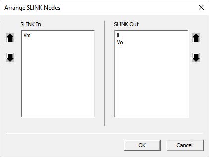 Arrange the order of the In nodes and Out nodes to be the same as how the input/output ports would appear in the PSIM block in Twin Activate. The order of the ports is from the top to the bottom. In this case, the output port corresponding to iL will be on the top, and the output port corresponding to Vo will be on the bottom. To rearrange the node sequence, highlight the name of the node, and click on the up or down arrow.