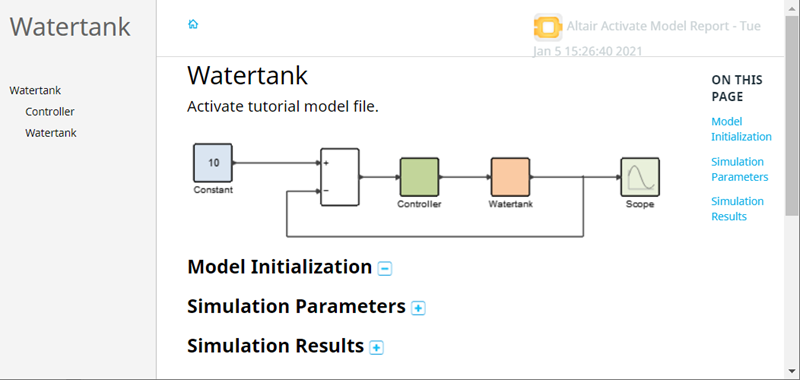 the report for the Watertank model looks something like this:The completed report includes a publishing date, the name of the model, an