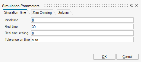 Before executing a simulation, you can define parameters for simulation time, zero-crossing and solvers.