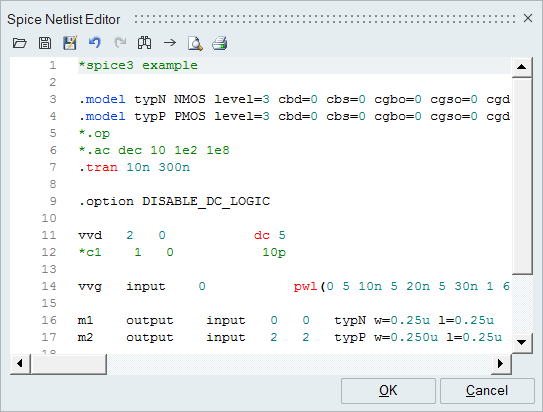 - Enter your netlist in the Editor or copy and paste it from an existing netlist file.