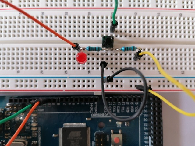 - On the breadboard, press the hardware button and observe how the light turns on and off.