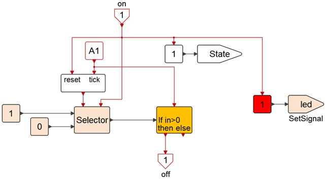 The on signal changes the value of the state to 1, and thus deactivates the state represented by the led off super block and activates the led on super block state. It also sets the signal led to 1, which turns on the LED light and resets the counter.