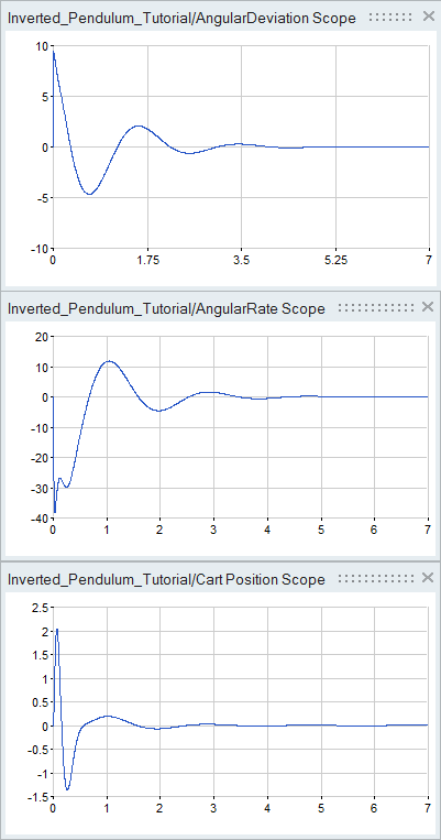 The Scope blocks in the model generate the following plots for the cart: Angular Deviation, Angular Rate and Cart Position.
