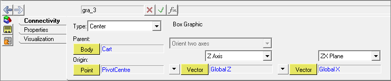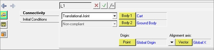 - For the Connectivity parameters, set the parent body to Ground Body; origin to Global Origin; and direction to vector Global X.