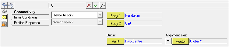 - For Connectivity parameters, set the parent body to Pendulum; set the origin to PendulumCenter; set the direction to the point PivotCenter.