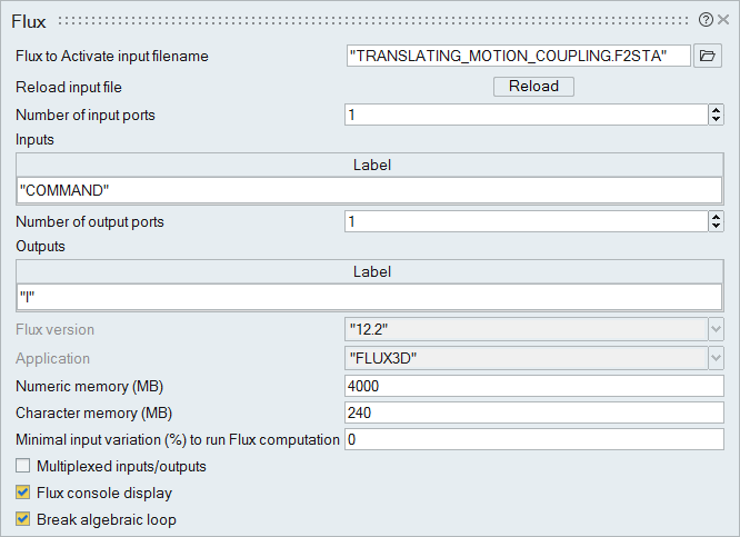 - Double-click the Flux block, and in the block dialog, for Flux to Activate input filename, enter the path to the coupling component you generated from Flux: <working_directory>/TRANSLATING_MOTION_COUPLING.F2STA.